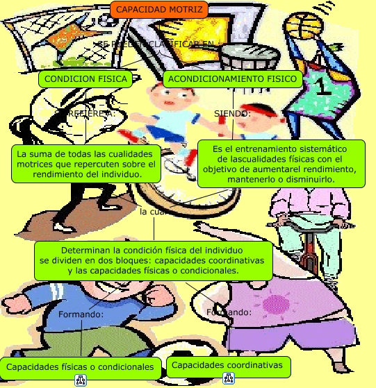 Este Cmap, tiene información relacionada con: Capacidad Motriz, Es el entrenamiento sistemático de lascualidades físicas con el objetivo de aumentarel rendimiento, mantenerlo o disminuirlo. la cual La suma de todas las cualidades motrices que repercuten sobre el rendimiento del individuo., CONDICION FISICA SE REFIERE A: La suma de todas las cualidades motrices que repercuten sobre el rendimiento del individuo., CAPACIDAD MOTRIZ SE PUEDEN CLASIFICAR EN : CONDICION FISICA, Determinan la condición física del individuo se dividen en dos bloques: capacidades coordinativas y las capacidades físicas o condicionales. Formando: Capacidades físicas o condicionales, Determinan la condición física del individuo se dividen en dos bloques: capacidades coordinativas y las capacidades físicas o condicionales. Formando: Capacidades coordinativas, Es el entrenamiento sistemático de lascualidades físicas con el objetivo de aumentarel rendimiento, mantenerlo o disminuirlo. la cual Determinan la condición física del individuo se dividen en dos bloques: capacidades coordinativas y las capacidades físicas o condicionales., ACONDICIONAMIENTO FISICO SIENDO: Es el entrenamiento sistemático de lascualidades físicas con el objetivo de aumentarel rendimiento, mantenerlo o disminuirlo., CAPACIDAD MOTRIZ SE PUEDEN CLASIFICAR EN : ACONDICIONAMIENTO FISICO