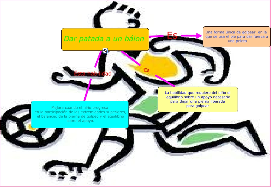 Este Cmap, tiene información relacionada con: mapa 11, Dar patada a un bálon Es Una forma única de golpear, en la que se usa el pie para dar fuerza a una pelota, Dar patada a un bálon Es La habilidad que requiere del niño el equilibrio sobre un apoyo necesario para dejar una pierna liberada para golpear, Dar patada a un bálon Ésta habilidad Mejora cuando el niño progresa en la participación de las extremidades superiores, el balanceo de la pierna de golpeo y el equilibrio sobre el apoyo.