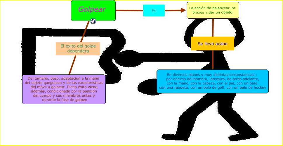 Este Cmap, tiene información relacionada con: mapa 10, Golpear El éxito del golpe dependera Del tamaño, peso, adaptación a la mano del objeto quegolpea y de las características del móvil a golpear. Dicho éxito viene, además, condicionado por la posición del cuerpo y sus miembros antes y durante la fase de golpeo, La acción de balancear los brazos y dar un objeto. Se lleva acabo En diversos planos y muy distintas circunstancias : por encima del hombro, laterales, de atrás adelante, con la mano, con la cabeza, con el pie, con un bate, con una raqueta, con un palo de golf, con un palo de hockey, Golpear Es La acción de balancear los brazos y dar un objeto.