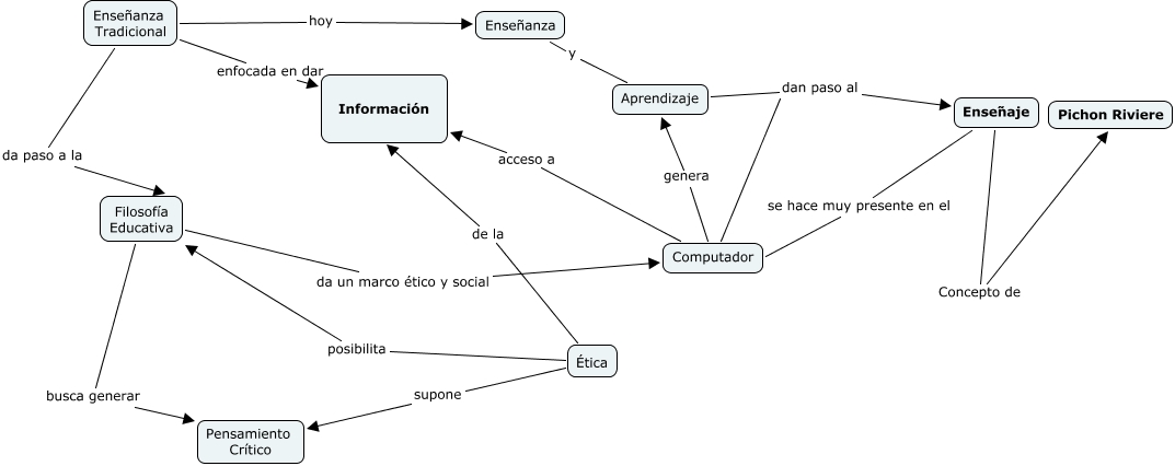 Este Cmap, tiene información relacionada con: Leandro Folgar, Enseñanza Tradicional da paso a la Filosofía Educativa, Ética supone Pensamiento Crítico, Enseñaje se hace muy presente en el Computador, Enseñanza Tradicional hoy Enseñanza, Enseñanza Tradicional enfocada en dar Información, Computador acceso a Información, Aprendizaje dan paso al Enseñaje, Enseñaje Concepto de Pichon Riviere, Computador dan paso al Enseñaje, Filosofía Educativa busca generar Pensamiento Crítico, Ética posibilita Filosofía Educativa, Enseñanza y Aprendizaje, Ética de la Información, Filosofía Educativa da un marco ético y social Computador, Computador genera Aprendizaje