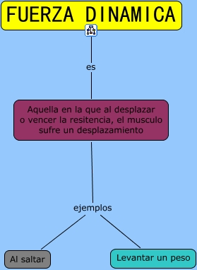 Este Cmap, tiene información relacionada con: fuerza dinamica, Aquella en la que al desplazar o vencer la resitencia, el musculo sufre un desplazamiento ejemplos Al saltar, Aquella en la que al desplazar o vencer la resitencia, el musculo sufre un desplazamiento ejemplos Levantar un peso, FUERZA DINAMICA es Aquella en la que al desplazar o vencer la resitencia, el musculo sufre un desplazamiento
