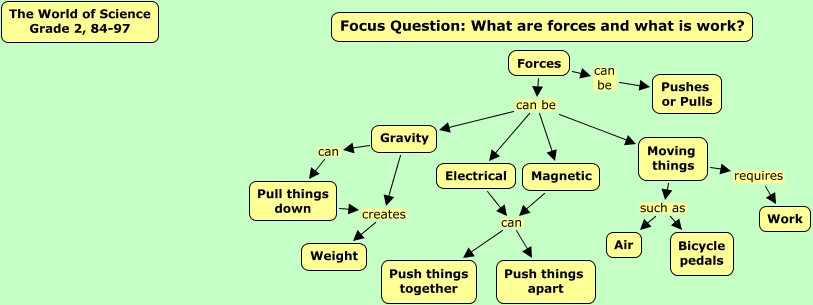 This Concept Map, created with IHMC CmapTools, has information related to: The World of Science, Pages 84-97, Gravity can Pull things down, Magnetic can Push things apart, Forces can be Magnetic, Moving things such as Air, Forces can be Pushes or Pulls, Forces can be Electrical, Forces can be Moving things, Gravity creates Weight, Moving things requires Work, Electrical can Push things together, Forces can be Gravity, Electrical can Push things apart, Magnetic can Push things together, Pull things down creates Weight, Moving things such as Bicycle pedals