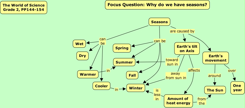 the world of science, pp144-154, the world of science grade 2, pp144-154, the sun, amount of heat energy, dry, fall, spring, cooler, summer, warmer, wet, seasons, earth's tilt on axis, earth's movement, one year, focus question why do we have seasons?, winter