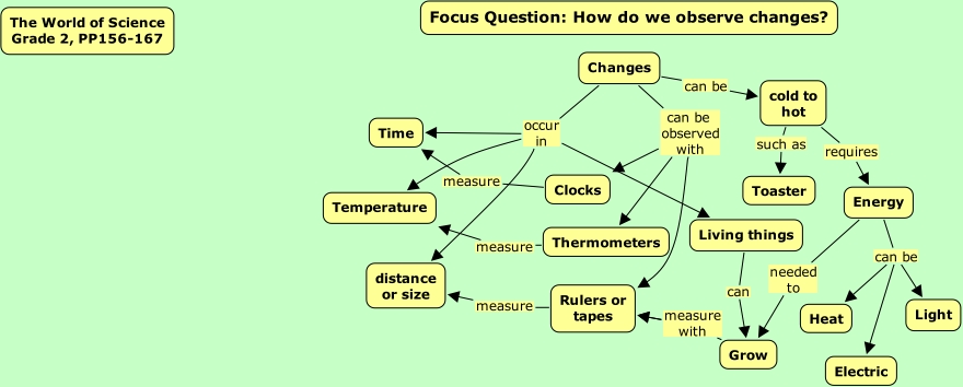 the world of science, pp 156-167, heat, time, changes, rulers or tapes, clocks, temperature, grow, living things, electric, light, distance or size, the world of science grade 2, pp156-167, focus question how do we observe changes?, energy, toaster, thermometers, cold to hot