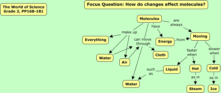 This Concept Map, created with IHMC CmapTools, has information related to: The World of Science, Pages 168-181, Air can move through Cloth, Moving slower when Cold, Molecules make up Air, Molecules make up Everything, Cold as in Ice, Molecules make up Water, Molecules can move through Water, Water can move through Cloth, Moving faster when Liquid, Moving faster when Hot, Energy from Moving, Hot as in Steam, Air can move through Water, Molecules have Energy, Water can move through Water, Molecules can move through Cloth, Molecules are always Moving, Liquid such as Water