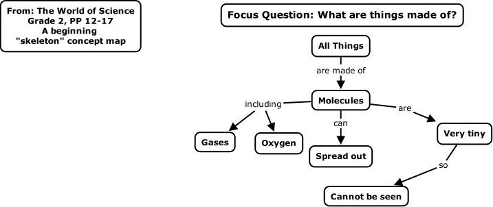 a skeleton concept map to begin understanding ideas in pages 12 to 17 b & w, cannot be seen, oxygen, all things, spread out, gases, very tiny, focus question what are things made of?, molecules, from the world of science grade 2, pp 12-17 a beginning skeleton concept map