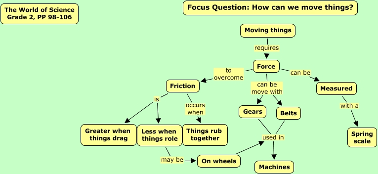 This Concept Map, created with IHMC CmapTools, has information related to: The World of Science, Pages 98-106, Force can be Measured, Less when things role may be On wheels, Friction is Greater when things drag, Force to overcome Friction, Force can be move with Belts, Belts used in Machines, Force can be move with Gears, Friction occurs when Things rub together, Gears used in Machines, Moving things requires Force, On wheels used in Machines, Measured with a Spring scale, Friction is Less when things role