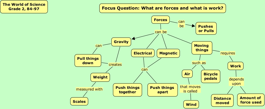 the world of science, pp 84-97, pull things down, electrical, distance moved, amount of force used, bicycle pedals, push things together, push things apart, forces, gravity, wind, air, scales, focus question what are forces and what is work?, work, magnetic, the world of science grade 2, 84-97, weight, moving things, pushes or pulls