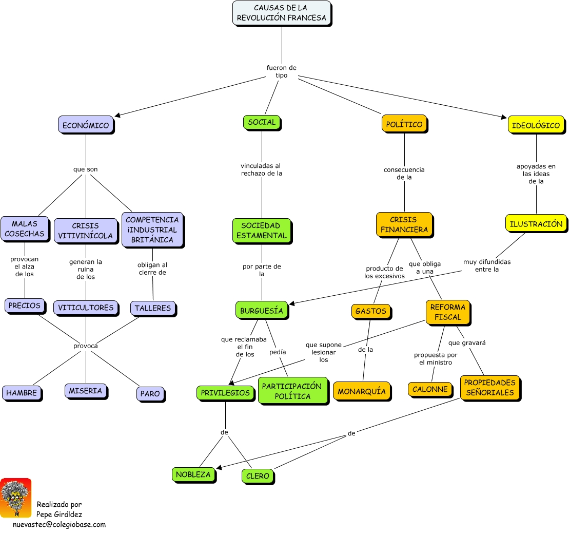 Este Cmap, tiene información relacionada con: Causas de la Rev. Francesa, POLÍTICO consecuencia de la CRISIS FINANCIERA, ILUSTRACIÓN muy difundidas entre la BURGUESÍA, VITICULTORES provoca PARO, SOCIAL vinculadas al rechazo de la SOCIEDAD ESTAMENTAL, ECONÓMICO que son COMPETENCIA iINDUSTRIAL BRITÁNICA, BURGUESÍA pedía PARTICIPACIÓN POLÍTICA, REFORMA FISCAL propuesta por el ministro CALONNE, CAUSAS DE LA REVOLUCIÓN FRANCESA fueron de tipo IDEOLÓGICO, ECONÓMICO que son MALAS COSECHAS, PRIVILEGIOS de CLERO, CRISIS FINANCIERA que obliga a una REFORMA FISCAL, MALAS COSECHAS provocan el alza de los PRECIOS, REFORMA FISCAL que gravará PROPIEDADES SEÑORIALES, PROPIEDADES SEÑORIALES de NOBLEZA, IDEOLÓGICO apoyadas en las ideas de la ILUSTRACIÓN, PRIVILEGIOS de NOBLEZA, GASTOS de la MONARQUÍA, CRISIS FINANCIERA producto de los excesivos GASTOS, CAUSAS DE LA REVOLUCIÓN FRANCESA fueron de tipo POLÍTICO, CAUSAS DE LA REVOLUCIÓN FRANCESA fueron de tipo SOCIAL