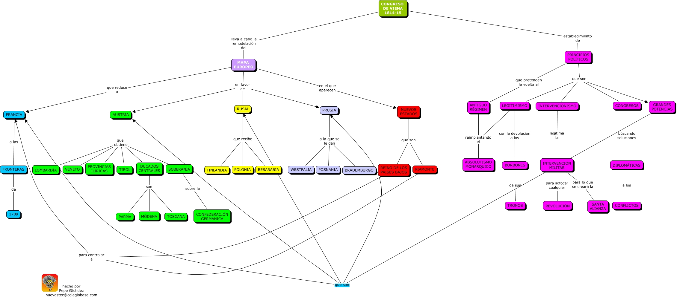 Este Cmap, tiene información relacionada con: Restauración-Comprobación, MAPA EUROPEO que reduce a FRANCIA, NUEVOS ESTADOS que son REINO DE LOS PAISES BAJOS, INTERVENCIÓN MILITAR para sofocar cualquier REVOLUCIÓN, BORBONES de sus TRONOS, PRINCIPIOS POLÍTICOS que pretenden la vuelta al ANTIGUO RÉGIMEN, CONGRESO DE VIENA 1814-15 establecimiento de PRINCIPIOS POLÍTICOS, AUSTRIA que obtiene DUCADOS CENTRALES, CONGRESOS búscando soluciones DIPLOMÁTICAS, AUSTRIA que obtiene SOBERANÍA, PRUSIA a la que se le dan POSNANIA, FRANCIA a las FRONTERAS, LEGITIMISMO reimplantando el ABSOLUTISMO MONARQUICO, DUCADOS CENTRALES son TOSCANA, MAPA EUROPEO en favor de AUSTRIA, DUCADOS CENTRALES son PARMA, PRINCIPIOS POLÍTICOS que son INTERVENCIONISMO, GRANDES POTENCIAS que son RUSIA, MAPA EUROPEO en el que aparecen NUEVOS ESTADOS, AUSTRIA que obtiene LOMBARDÍA, PRINCIPIOS POLÍTICOS que son CONGRESOS