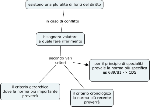 Questa Cmap, creata con IHMC CmapTools, contiene informazioni relative a: 03. Scelta della fonte da adottare - principi, bisognerà valutare a quale fare riferimento secondo vari criteri il criterio gerarchico dove la norma più importante preverrà, bisognerà valutare a quale fare riferimento secondo vari criteri per il principio di specialità prevale la norma più specifica es 689/81 -> CDS, esistono una pluralità di fonti del diritto in caso di conflitto bisognerà valutare a quale fare riferimento, bisognerà valutare a quale fare riferimento secondo vari criteri il criterio cronologico la norma più recente preverrà