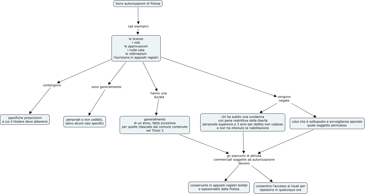 Questa Cmap, creata con IHMC CmapTools, contiene informazioni relative a: Maggioli 4. Artt 8-16 (tranne 15) Autorizzazioni di Polizia, chi ha subito una condanna con pena restrittiva della libertà personale superiore a 3 anni per delitto non colposo e non ha ottenuto la riabilitazione gli esercenti di attività commerciali soggette ad autorizzazione devono conservarle in appositi registri bollati e ispezionabili dalla Polizia, generalmente di un anno, fatta eccezione per quelle rilasciate dal comune contenute nel Titolo 3 gli esercenti di attività commerciali soggette ad autorizzazione devono consentire l'accesso ai locali per ispezione in qualunque ora, le licenze i visti le approvazioni i nulla osta le vidimazioni l'iscrizione in appositi registri vengono negate colui che è sottoposto a sorveglianza speciale quale soggetto pericoloso, le licenze i visti le approvazioni i nulla osta le vidimazioni l'iscrizione in appositi registri vengono negate chi ha subito una condanna con pena restrittiva della libertà personale superiore a 3 anni per delitto non colposo e non ha ottenuto la riabilitazione, le licenze i visti le approvazioni i nulla osta le vidimazioni l'iscrizione in appositi registri sono generalmente personali e non cedibili, salvo alcuni casi specifici, le licenze i visti le approvazioni i nulla osta le vidimazioni l'iscrizione in appositi registri contengono specifiche prescrizioni a cui il titolare deve attenersi, colui che è sottoposto a sorveglianza speciale quale soggetto pericoloso gli esercenti di attività commerciali soggette ad autorizzazione devono conservarle in appositi registri bollati e ispezionabili dalla Polizia, generalmente di un anno, fatta eccezione per quelle rilasciate dal comune contenute nel Titolo 3 gli esercenti di attività commerciali soggette ad autorizzazione devono conservarle in appositi registri bollati e ispezionabili dalla Polizia, le licenze i visti le approvazioni i nulla osta le vidimazioni l'iscrizione in appositi registri hanno una durata generalmente di un anno, fatta eccezione per quelle rilasciate dal comune contenute nel Titolo 3, Sono autorizzazioni di Polizia (ad esempio) le licenze i visti le approvazioni i nulla osta le vidimazioni l'iscrizione in appositi registri, colui che è sottoposto a sorveglianza speciale quale soggetto pericoloso gli esercenti di attività commerciali soggette ad autorizzazione devono consentire l'accesso ai locali per ispezione in qualunque ora, chi ha subito una condanna con pena restrittiva della libertà personale superiore a 3 anni per delitto non colposo e non ha ottenuto la riabilitazione gli esercenti di attività commerciali soggette ad autorizzazione devono consentire l'accesso ai locali per ispezione in qualunque ora