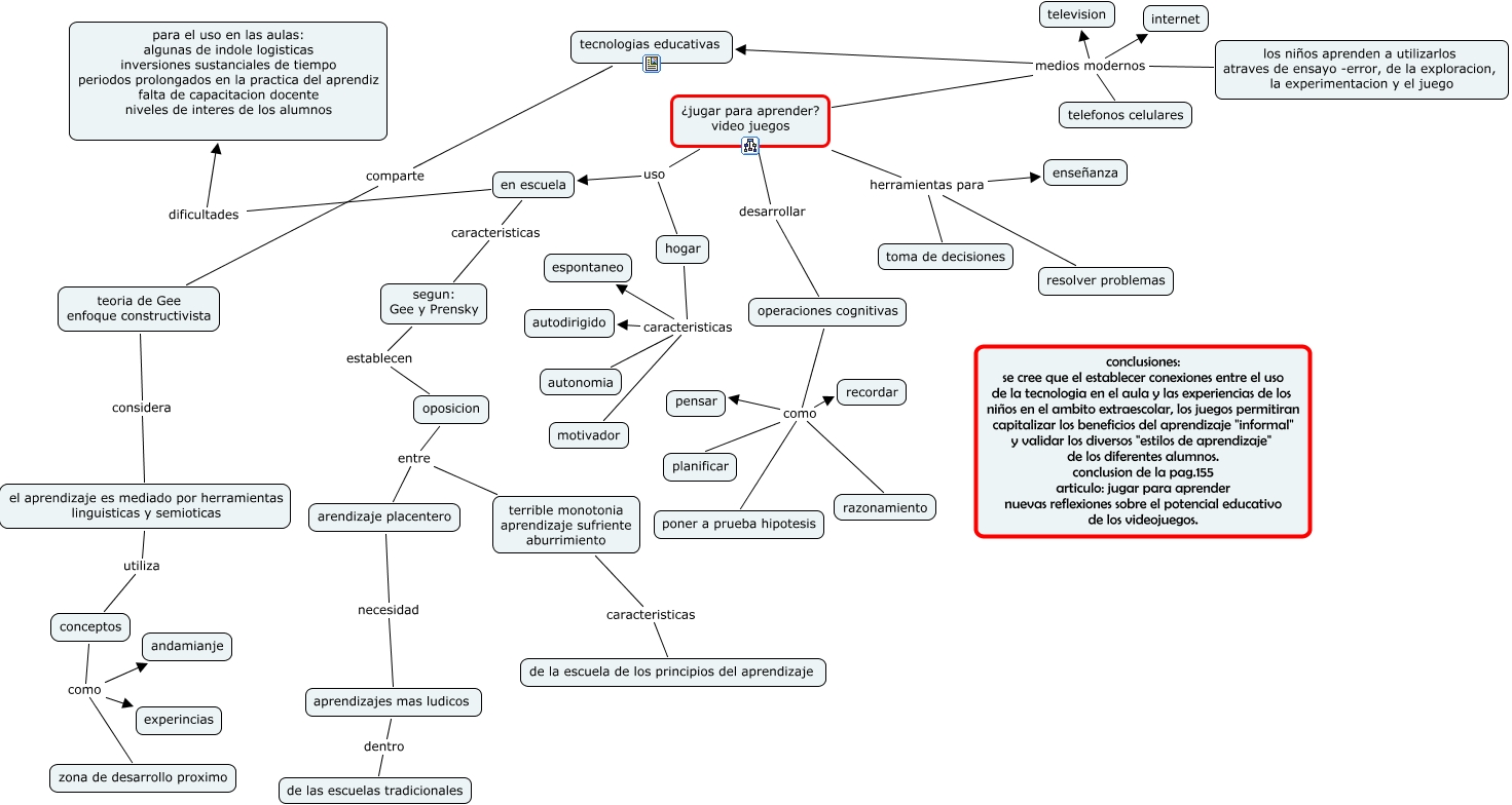 Este Cmap, tiene información relacionada con: BUCKINGHAM 2008 nuevas reflexiones sobre el potencial educativo de los videojuegos, ¿jugar para aprender? video juegos medios modernos television, operaciones cognitivas como recordar, hogar caracteristicas espontaneo, ¿jugar para aprender? video juegos uso hogar, teoria de Gee enfoque constructivista considera el aprendizaje es mediado por herramientas linguisticas y semioticas, operaciones cognitivas como pensar, los niños aprenden a utilizarlos atraves de ensayo -error, de la exploracion, la experimentacion y el juego medios modernos television, terrible monotonia aprendizaje sufriente aburrimiento caracteristicas de la escuela de los principios del aprendizaje, oposicion entre arendizaje placentero, arendizaje placentero necesidad aprendizajes mas ludicos, ¿jugar para aprender? video juegos herramientas para toma de decisiones, ¿jugar para aprender? video juegos herramientas para resolver problemas, oposicion entre terrible monotonia aprendizaje sufriente aburrimiento, aprendizajes mas ludicos dentro de las escuelas tradicionales, tecnologias educativas comparte teoria de Gee enfoque constructivista, hogar caracteristicas autodirigido, conceptos como experincias, los niños aprenden a utilizarlos atraves de ensayo -error, de la exploracion, la experimentacion y el juego medios modernos tecnologias educativas, ¿jugar para aprender? video juegos desarrollar operaciones cognitivas, los niños aprenden a utilizarlos atraves de ensayo -error, de la exploracion, la experimentacion y el juego medios modernos internet
