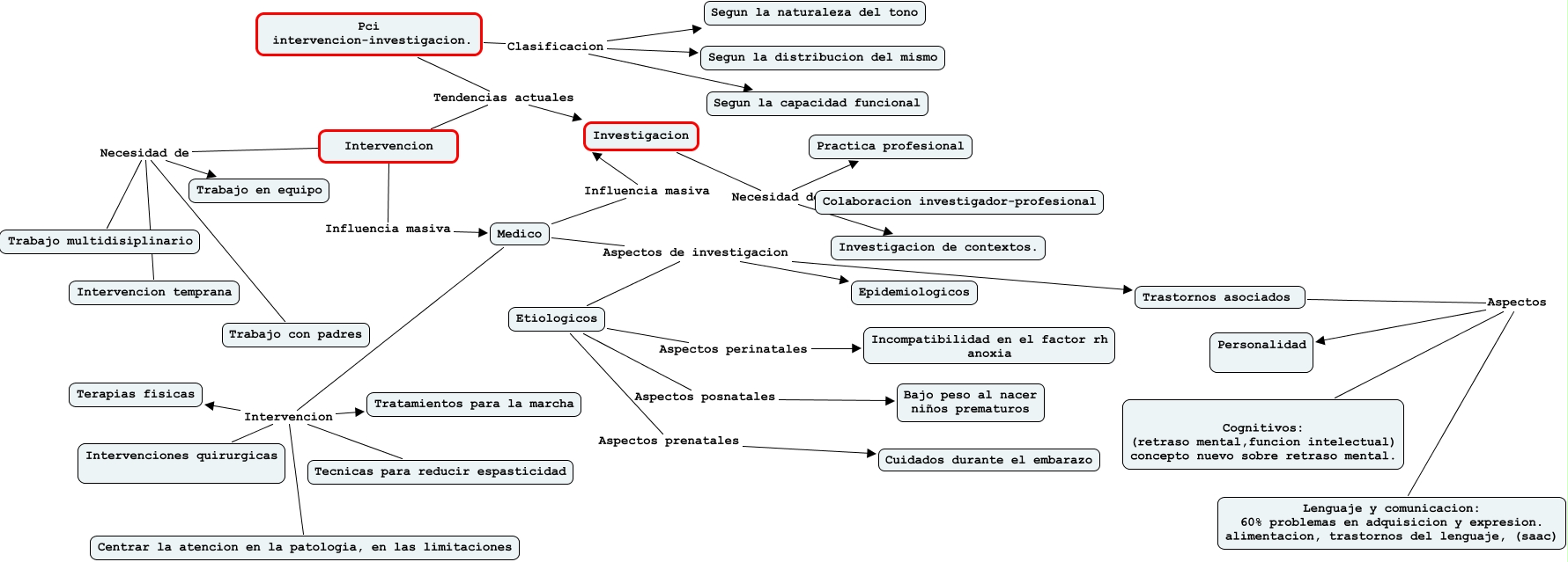 Este Cmap, tiene información relacionada con: investigacion-intervencion de la paralisis cerebral, Medico Intervencion Tratamientos para la marcha, Investigacion Necesidad de Investigacion de contextos., Trastornos asociados Aspectos Personalidad, Medico Aspectos de investigacion Trastornos asociados, Etiologicos Aspectos perinatales Incompatibilidad en el factor rh anoxia, Medico Intervencion Centrar la atencion en la patologia, en las limitaciones, Pci intervencion-investigacion. Tendencias actuales Intervencion, Etiologicos Aspectos posnatales Bajo peso al nacer niños prematuros, Medico Influencia masiva Investigacion, Medico Intervencion Tecnicas para reducir espasticidad, Pci intervencion-investigacion. Clasificacion Segun la distribucion del mismo, Investigacion Necesidad de Colaboracion investigador-profesional, Intervencion Necesidad de Trabajo con padres, Medico Intervencion Terapias fisicas, Investigacion Necesidad de Practica profesional, Intervencion Necesidad de Trabajo en equipo, Trastornos asociados Aspectos Lenguaje y comunicacion: 60% problemas en adquisicion y expresion. alimentacion, trastornos del lenguaje, (saac), Pci intervencion-investigacion. Tendencias actuales Investigacion, Pci intervencion-investigacion. Clasificacion Segun la capacidad funcional, Medico Intervencion Intervenciones quirurgicas