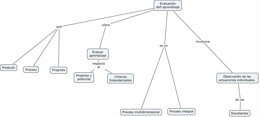 Este Cmap, tiene información relacionada con: Evaluar el Aprendizaje, Evaluar aprendizaje respecto al Criterios Estandarizados, Evaluación deñ aprendizaje qué Proceso, Evaluación deñ aprendizaje cómo Evaluar aprendizaje, Evaluación deñ aprendizaje es un Proceso multidimensional, Evaluar aprendizaje respecto al Progreso y potencial, Evaluación deñ aprendizaje involucra Observación de las actuaciones individuales., Observación de las actuaciones individuales. de los Estudiantes, Evaluación deñ aprendizaje es un Proceso integral, Evaluación deñ aprendizaje qué Progreso, Evaluación deñ aprendizaje qué Producto
