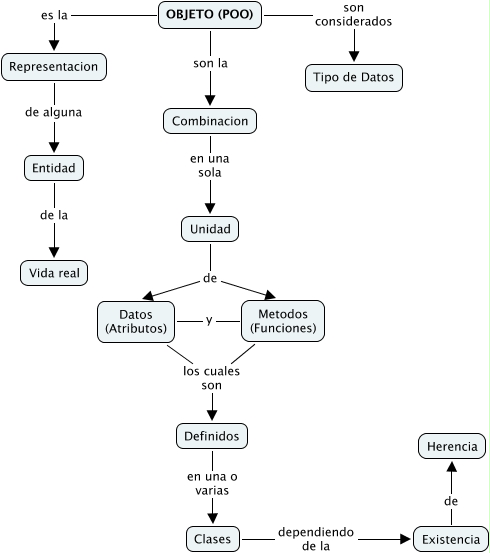 Este Cmap, tiene información relacionada con: Objeto (POO), Representacion de alguna Entidad, OBJETO (POO) son considerados Tipo de Datos, Datos (Atributos) y Metodos (Funciones), Existencia de Herencia, Datos (Atributos) los cuales son Definidos, Definidos en una o varias Clases, Entidad de la Vida real, Clases dependiendo de la Existencia, Combinacion en una sola Unidad, Unidad de Metodos (Funciones), Unidad de Datos (Atributos), OBJETO (POO) son la Combinacion, OBJETO (POO) es la Representacion, Metodos (Funciones) los cuales son Definidos