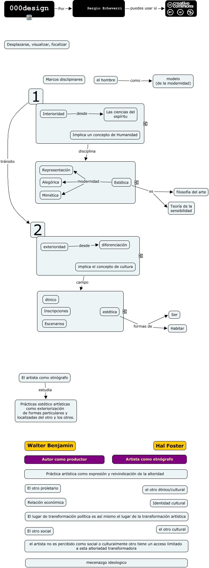 Este Cmap, tiene información relacionada con: Desplazarse, visualizar, focalizar, investigación-creación, 000design Por Sergio Echeverri, estética formas de Ser, Estética es Teoría de la sensibilidad, el hombre como modelo (de la modernidad), Estética modernidad Alegórica, Sergio Echeverri puedes usar si, estética formas de Habitar, ???? campo ????, Interioridad desde Las ciencias del espíritu, Estética modernidad Mimética, ???? disciplina ????, exterioridad desde diferenciación, El artista como etnógrafo estudia Prácticas estético artísticas como exteriorización de formas particulares y localizadas del otro y los otros., Estética es filosofia del arte, Estética modernidad Representación, 1 tránsito 2