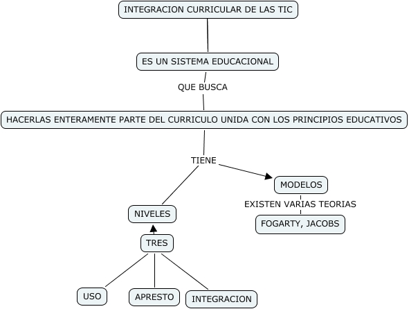 Este Cmap, tiene información relacionada con: JUANSE, ES UN SISTEMA EDUCACIONAL QUE BUSCA HACERLAS ENTERAMENTE PARTE DEL CURRICULO UNIDA CON LOS PRINCIPIOS EDUCATIVOS, INTEGRACION ???? NIVELES, INTEGRACION ???? APRESTO, HACERLAS ENTERAMENTE PARTE DEL CURRICULO UNIDA CON LOS PRINCIPIOS EDUCATIVOS TIENE NIVELES, ES UN SISTEMA EDUCACIONAL ???? INTEGRACION CURRICULAR DE LAS TIC, INTEGRACION ???? USO, MODELOS EXISTEN VARIAS TEORIAS FOGARTY, JACOBS, HACERLAS ENTERAMENTE PARTE DEL CURRICULO UNIDA CON LOS PRINCIPIOS EDUCATIVOS TIENE MODELOS