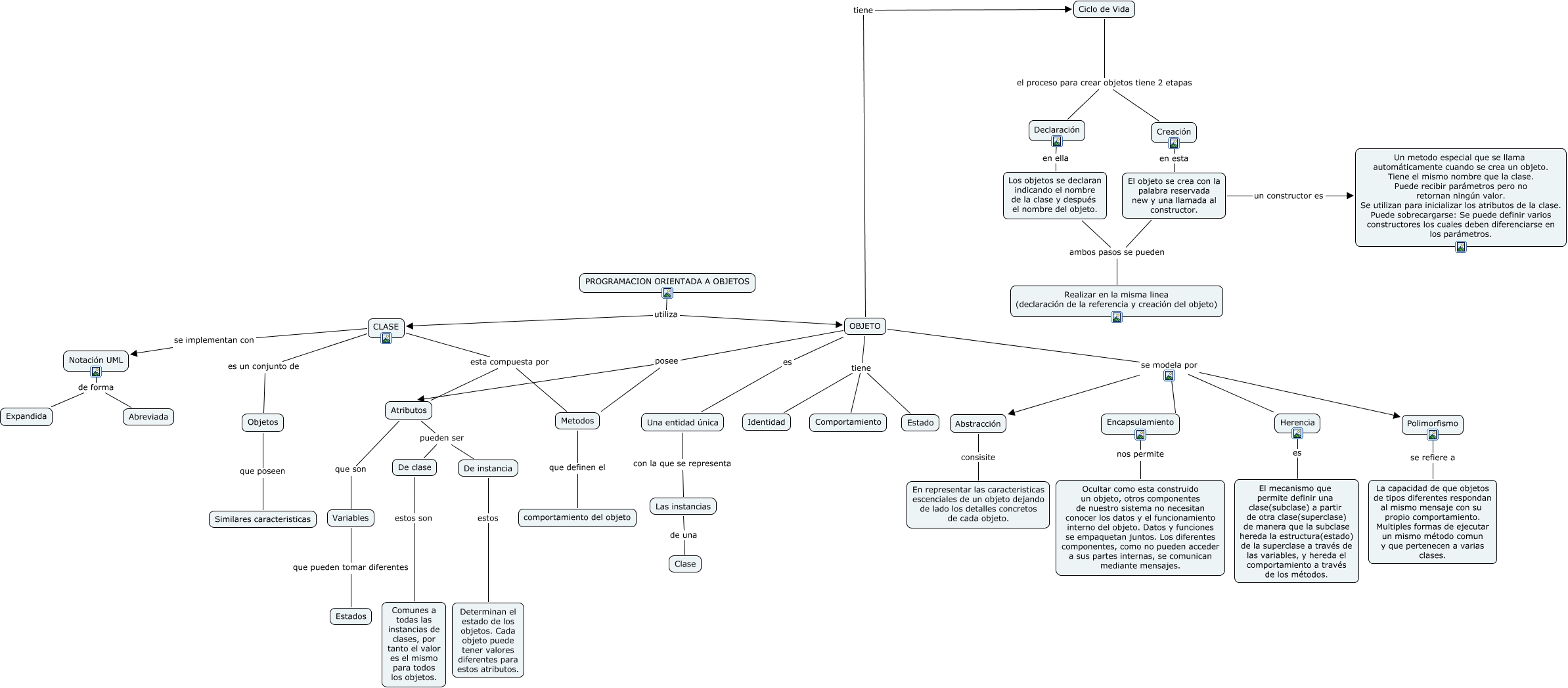 Este Cmap, tiene información relacionada con: Clase y Objeto, Objetos que poseen Similares caracteristicas, OBJETO posee Atributos, OBJETO se modela por Polimorfismo, El objeto se crea con la palabra reservada new y una llamada al constructor. ambos pasos se pueden Realizar en la misma linea (declaración de la referencia y creación del objeto), OBJETO posee Metodos, Atributos que son Variables, Declaración en ella Los objetos se declaran indicando el nombre de la clase y después el nombre del objeto., OBJETO se modela por Herencia, Notación UML de forma Abreviada, OBJETO tiene Ciclo de Vida, Atributos pueden ser De instancia, Variables que pueden tomar diferentes Estados, Las instancias de una Clase, Creación en esta El objeto se crea con la palabra reservada new y una llamada al constructor., Abstracción consisite En representar las caracteristicas escenciales de un objeto dejando de lado los detalles concretos de cada objeto., OBJETO tiene Identidad, OBJETO es Una entidad única, OBJETO tiene Comportamiento, De instancia estos Determinan el estado de los objetos. Cada objeto puede tener valores diferentes para estos atributos., CLASE esta compuesta por Atributos
