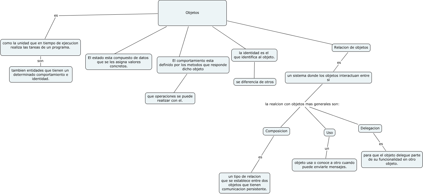 Este Cmap, tiene información relacionada con: objetos, un sistema donde los objetos interactuan entre si la realcion con objetos mas generales son: Delegacion, Objetos ???? Relacion de objetos, Uso un objeto usa o conoce a otro cuando puede enviarle mensajes., un sistema donde los objetos interactuan entre si la realcion con objetos mas generales son: Composicion, Relacion de objetos es un sistema donde los objetos interactuan entre si, Objetos ???? El estado esta compuesto de datos que se les asigna valores concretos., El comportamiento esta definido por los metodos que responde dicho objeto ???? que operaciones se puede realizar con el., Objetos es como la unidad que en tiempo de ejecucion realiza las tareas de un programa., Objetos ???? El comportamiento esta definido por los metodos que responde dicho objeto, Delegacion es para que el objeto delegue parte de su funcionalidad en otro objeto., la identidad es el que identifica al objeto. ???? se diferencia de otros, Composicion es un tipo de relacion que se establece entre dos objetos que tienen comunicacion persistente., un sistema donde los objetos interactuan entre si la realcion con objetos mas generales son: Uso, como la unidad que en tiempo de ejecucion realiza las tareas de un programa. son tambien entidades que tienen un determinado comportamiento e identidad., Objetos ???? la identidad es el que identifica al objeto.