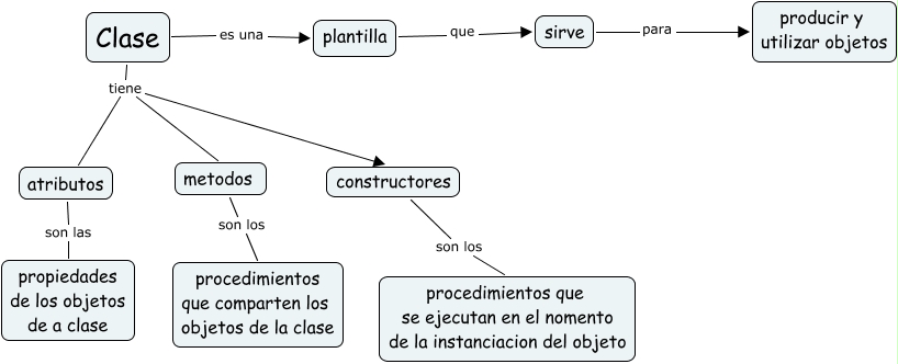 Este Cmap, tiene información relacionada con: Clase, Clase tiene atributos, metodos son los procedimientos que comparten los objetos de la clase, Clase es una plantilla, Clase tiene metodos, plantilla que sirve, atributos son las propiedades de los objetos de a clase, sirve para producir y utilizar objetos, constructores son los procedimientos que se ejecutan en el nomento de la instanciacion del objeto, Clase tiene constructores