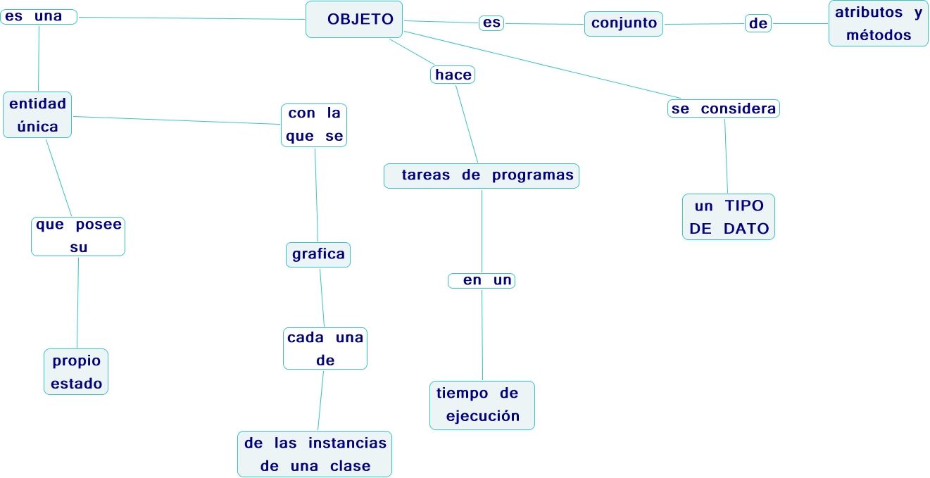 Este Cmap, tiene información relacionada con: Objeto, entidad única que posee su propio estado, conjunto de atributos y métodos, OBJETO se considera un TIPO DE DATO, OBJETO es conjunto, entidad única con la que se grafica, grafica cada una de de las instancias de una clase, tareas de programas en un tiempo de ejecución, OBJETO hace tareas de programas, OBJETO es una entidad única