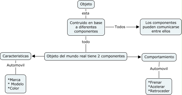 Este Cmap, tiene información relacionada con: Objeto, Comportamiento Automovil *Frenar *Acelerar *Retroceder, Objeto esta Contruido en base a diferentes componentes, Objeto del mundo real tiene 2 componentes ???? Comportamiento, Contruido en base a diferentes componentes todo Objeto del mundo real tiene 2 componentes, Contruido en base a diferentes componentes Todos Los componentes pueden comunicarse entre ellos, Caracteristicas Automovil *Marca * Modelo *Color, Objeto del mundo real tiene 2 componentes ???? Caracteristicas