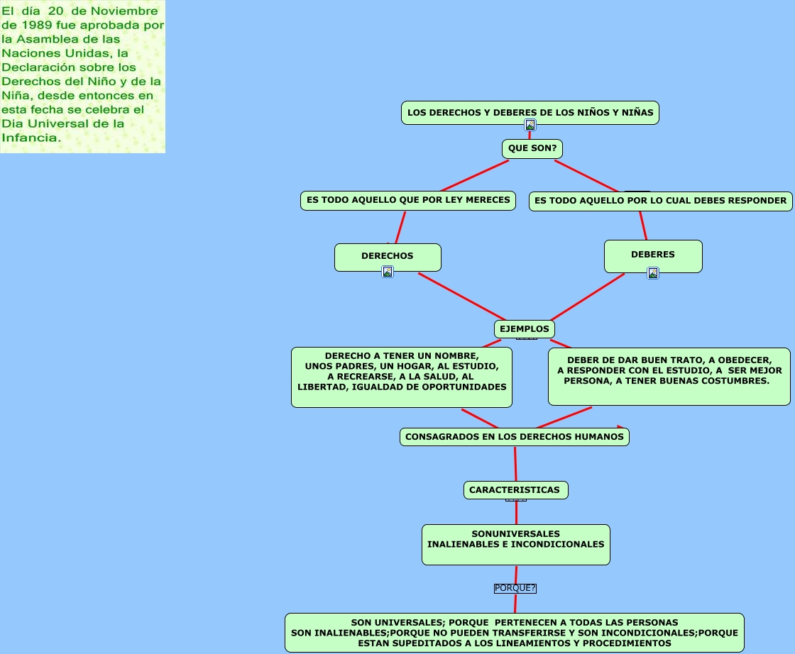 Este Cmap, tiene información relacionada con: LOS DERECHOS Y DEBERES, EJEMPLOS ???? DERECHO A TENER UN NOMBRE, UNOS PADRES, UN HOGAR, AL ESTUDIO, A RECREARSE, A LA SALUD, AL LIBERTAD, IGUALDAD DE OPORTUNIDADES, ES TODO AQUELLO QUE POR LEY MERECES ???? DERECHOS, QUE SON? ???? ES TODO AQUELLO POR LO CUAL DEBES RESPONDER, QUE SON? ???? ES TODO AQUELLO QUE POR LEY MERECES, LOS DERECHOS Y DEBERES DE LOS NIÑOS Y NIÑAS ???? QUE SON?, DEBERES ???? EJEMPLOS, DERECHO A TENER UN NOMBRE, UNOS PADRES, UN HOGAR, AL ESTUDIO, A RECREARSE, A LA SALUD, AL LIBERTAD, IGUALDAD DE OPORTUNIDADES ???? CONSAGRADOS EN LOS DERECHOS HUMANOS, ES TODO AQUELLO POR LO CUAL DEBES RESPONDER ???? ????, DEBER DE DAR BUEN TRATO, A OBEDECER, A RESPONDER CON EL ESTUDIO, A SER MEJOR PERSONA, A TENER BUENAS COSTUMBRES. ???? CONSAGRADOS EN LOS DERECHOS HUMANOS, CARACTERISTICAS ???? SONUNIVERSALES INALIENABLES E INCONDICIONALES, ???? ???? DEBERES, CONSAGRADOS EN LOS DERECHOS HUMANOS ???? CARACTERISTICAS, EJEMPLOS ???? DEBER DE DAR BUEN TRATO, A OBEDECER, A RESPONDER CON EL ESTUDIO, A SER MEJOR PERSONA, A TENER BUENAS COSTUMBRES., DERECHOS ???? EJEMPLOS, SONUNIVERSALES INALIENABLES E INCONDICIONALES PORQUE? SON UNIVERSALES; PORQUE PERTENECEN A TODAS LAS PERSONAS SON INALIENABLES;PORQUE NO PUEDEN TRANSFERIRSE Y SON INCONDICIONALES;PORQUE ESTAN SUPEDITADOS A LOS LINEAMIENTOS Y PROCEDIMIENTOS