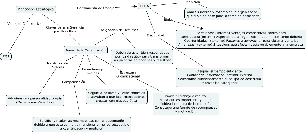 Este Cmap, tiene información relacionada con: Estrategia Mapa 1, Áreas de la Organización Inculación de Valores Adquiere una personalidad propia (Organismos Vivientes), FODA Siglas Fortalezas: (Interno) Ventajas competitivas controladas Debilidades:(Interno) Aspectos de la organizacion que no son como deberia Oportunidades: (externo) Factores a aprovechar para obtener ventajas Amenazas: (externo) Situacions que afectan desfavorablemente a la empresa, Áreas de la Organización Compensación Es dificil vincular las recompensas con el desempeño debido a que este es multidimensional y menos susceptible a cuantificación y medición, Planeacion Estrategica Ventajas Competitivas ????, Áreas de la Organización Asignación de Recursos Deben de estar bien respandados por los direcitov para transformar las palabras en acciones y resultado, Planeacion Estrategica Claves para la Gerencia por Jhon Ikris Áreas de la Organización, Planeacion Estrategica Herramienta de trabajo FODA, Áreas de la Organización Estándares y medidas Seguir la politicas y llevar controles coadyuban a que las organizaciones crezcan con elevada ética, FODA Definición Análisis interno y externo de la organización, que sirve de base para la toma de desiciones, FODA Efectividad Asignar el tiempo suficiente Contar con Informacion internar-externa Seleccionar cuidadosamente al equipo de desarrollo Priorizar las catergorias, Áreas de la Organización Estructura Organizacional Divide el trabajo a realizar Indica que es importante y que no Moldea la cultura de la compañia Constituye una fuente de recompensas y motivación.