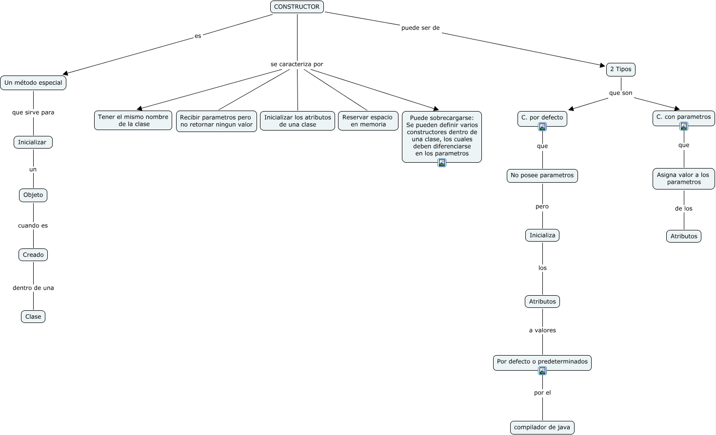 Este Cmap, tiene información relacionada con: Constructor, CONSTRUCTOR se caracteriza por Puede sobrecargarse: Se pueden definir varios constructores dentro de una clase, los cuales deben diferenciarse en los parametros, Un método especial que sirve para Inicializar, CONSTRUCTOR se caracteriza por Reservar espacio en memoria, Inicializar un Objeto, CONSTRUCTOR se caracteriza por Inicializar los atributos de una clase, CONSTRUCTOR es Un método especial, CONSTRUCTOR se caracteriza por Tener el mismo nombre de la clase, Asigna valor a los parametros de los Atributos, CONSTRUCTOR puede ser de 2 Tipos, Atributos a valores Por defecto o predeterminados, Inicializa los Atributos, 2 Tipos que son C. por defecto, C. con parametros que Asigna valor a los parametros, No posee parametros pero Inicializa, Por defecto o predeterminados por el compilador de java, CONSTRUCTOR se caracteriza por Recibir parametros pero no retornar ningun valor, C. por defecto que No posee parametros, 2 Tipos que son C. con parametros, Objeto cuando es Creado, Creado dentro de una Clase