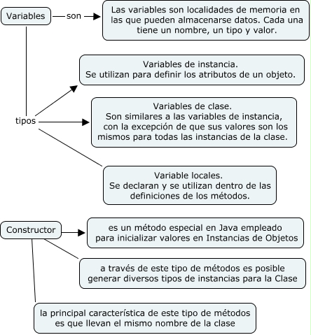 Este Cmap, tiene información relacionada con: Tipo de variable, constructor y argumentos, Variables tipos Variable locales. Se declaran y se utilizan dentro de las definiciones de los métodos., Variables son Las variables son localidades de memoria en las que pueden almacenarse datos. Cada una tiene un nombre, un tipo y valor., Constructor ???? a través de este tipo de métodos es posible generar diversos tipos de instancias para la Clase, Variables tipos Variables de clase. Son similares a las variables de instancia, con la excepción de que sus valores son los mismos para todas las instancias de la clase., Constructor ???? es un método especial en Java empleado para inicializar valores en Instancias de Objetos, Variables tipos Variables de instancia. Se utilizan para definir los atributos de un objeto., Constructor ???? la principal característica de este tipo de métodos es que llevan el mismo nombre de la clase