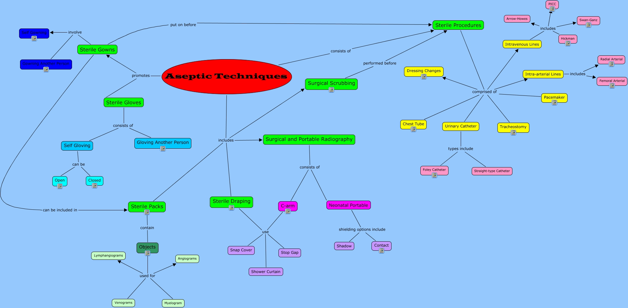 This Concept Map, created with IHMC CmapTools, has information related to: aseptic technique, Sterile Procedures comprised of Intravenous Lines, Sterile Procedures comprised of Urinary Catheter, Sterile Draping use Stop Gap, Sterile Gowns can be included in Sterile Packs, Pacemaker comprised of Tracheostomy, Self Gloving can be Closed, Pacemaker comprised of Urinary Catheter, Sterile Draping use Snap Cover, Sterile Procedures comprised of Tracheostomy, Surgical and Portable Radiography consists of Neonatal Portable, C-arm use Stop Gap, Aseptic Techniques includes Surgical and Portable Radiography, Intra-arterial Lines includes Radial Arterial, Aseptic Techniques includes Sterile Draping, Objects used for Myelogram, Intravenous Lines includes Swan-Ganz, Sterile Gloves consists of Self Gloving, Aseptic Techniques includes Sterile Packs, Surgical and Portable Radiography consists of C-arm, Aseptic Techniques includes Surgical Scrubbing