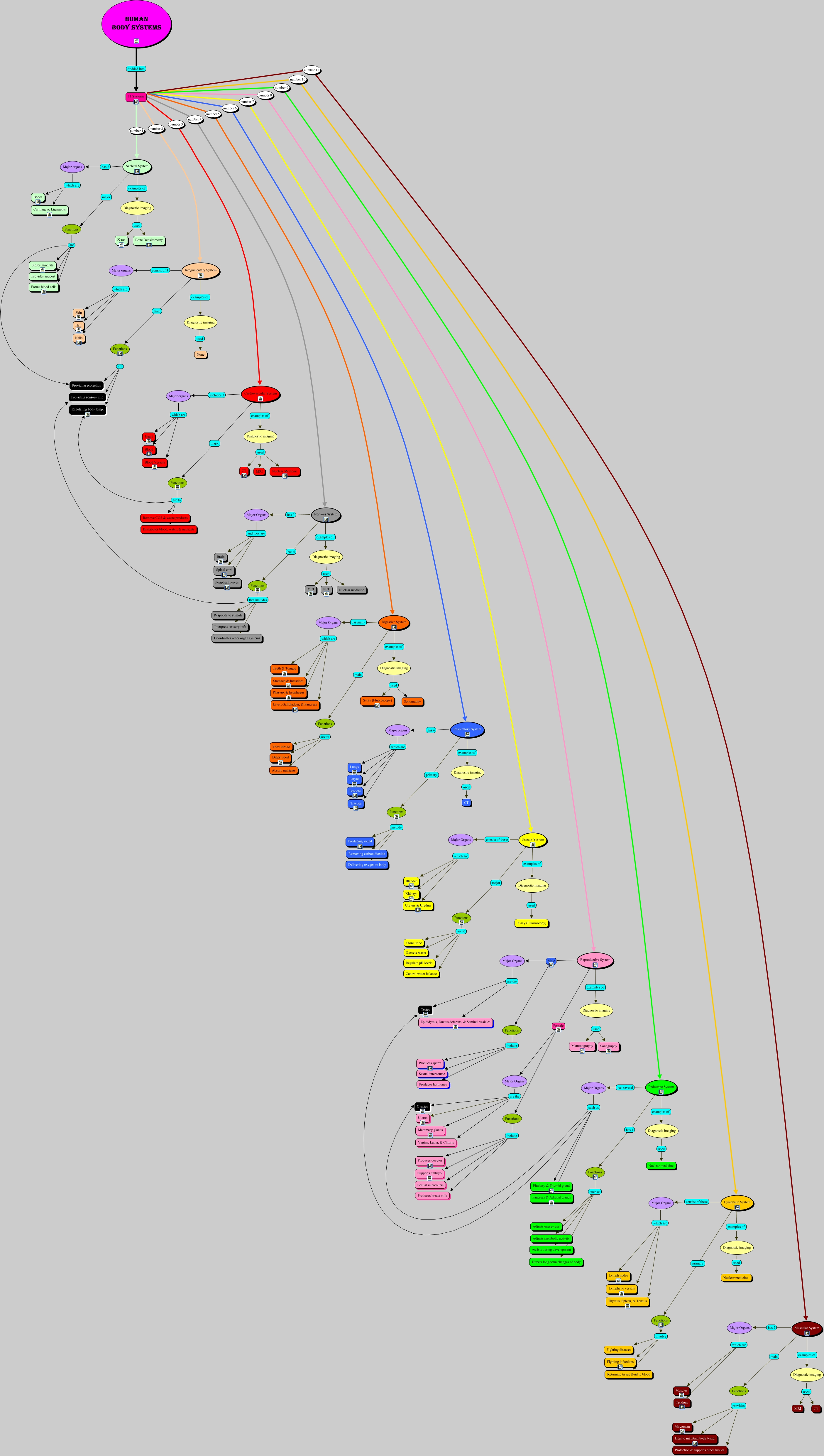 This Concept Map, created with IHMC CmapTools, has information related to: Jordan & Linh, Muscular System main Functions, Major Organs which are Tendons, Functions are to Regulate pH levels, Functions such as Directs long-term changes of body, Cardiovascular System includes 3 Major organs, Major organs which are Bones, Major organs which are Larynx, 11 Systems number 6 Respiratory System, 11 Systems number 9 Endocrine System, Functions involve Fighting diseases, Functions include Produces hormones, Diagnostic imaging used Sonography, Diagnostic imaging used CT, Diagnostic imaging used Bone Densitometry, Major Organs which are Muscles, Nervous System examples of Diagnostic imaging, Nervous System has 4 Functions, Functions that includes Coordinates other organ systems, Functions include Sexual intercourse, Major organs which are Cartilage & Ligaments