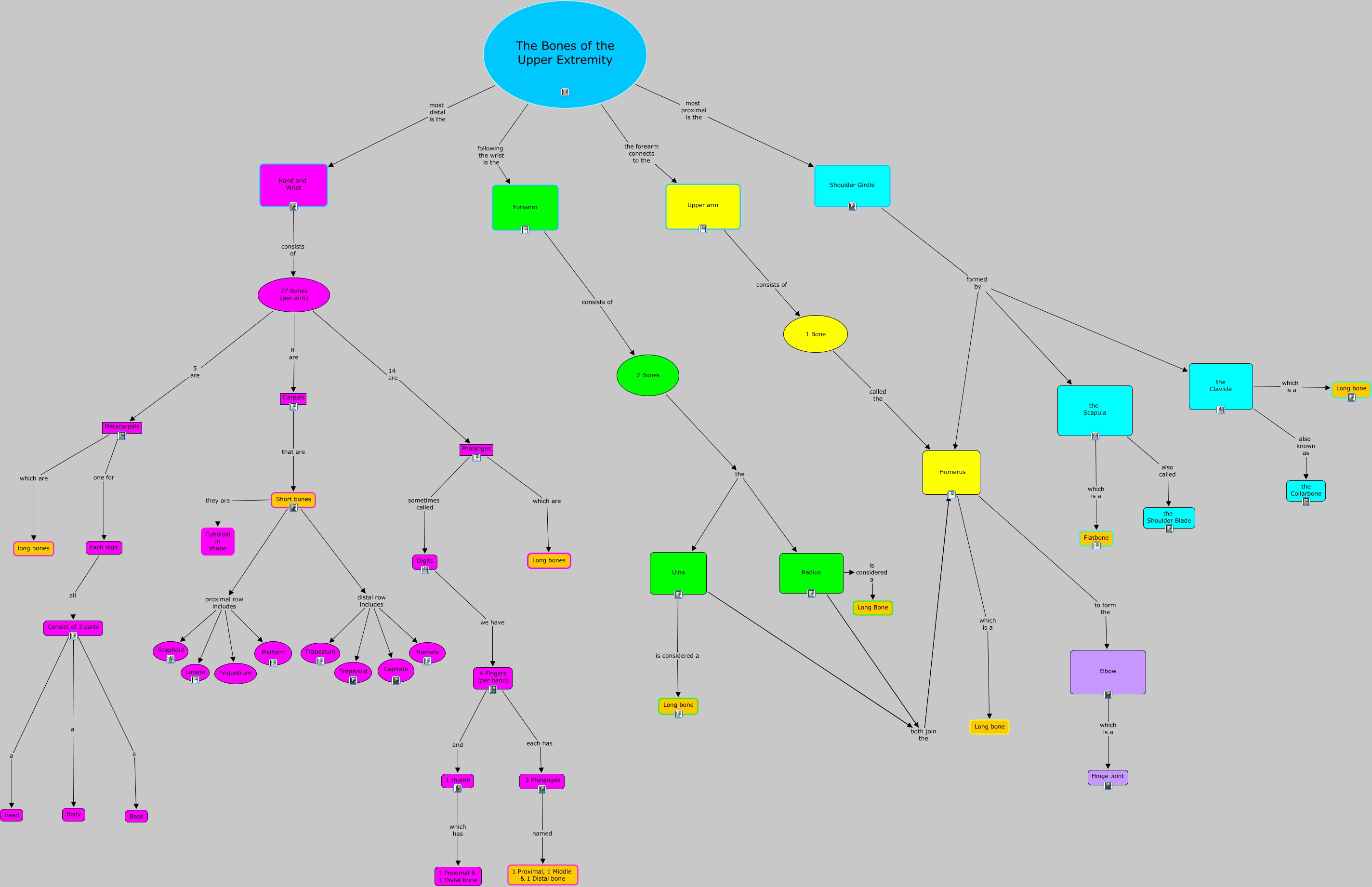 This Concept Map, created with IHMC CmapTools, has information related to: Candace & Cathy, Short bones distal row includes Capitate, The Bones of the Upper Extremity the forearm connects to the Upper arm, The Bones of the Upper Extremity most distal is the Hand and Wrist, Radius both join the Ulna, 27 Bones (per arm) 5 are Metacarpals, Short bones proximal row includes Triquetrum, 3 Phalanges named 1 Proximal, 1 Middle & 1 Distal bone, Consist of 3 parts a Body, Short bones they are Cuboidal in shape, Short bones distal row includes Trapezium, Humerus which is a Long bone, the Scapula also called the Shoulder Blade, 27 Bones (per arm) 14 are Phalanges, Shoulder Girdle formed by the Scapula, Metacarpals one for Each digit, Elbow which is a Hinge Joint, Ulna both join the Radius, 27 Bones (per arm) 8 are Carpals, Ulna both join the Humerus, Each digit all Consist of 3 parts