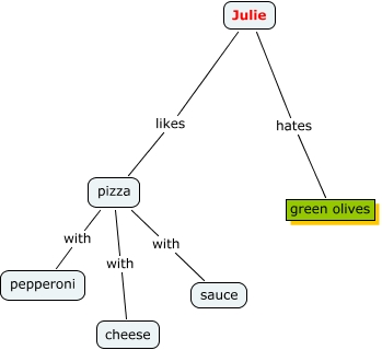 This Concept Map, created with IHMC CmapTools, has information related to: julie sec02, pizza with pepperoni, pizza with sauce, Julie likes pizza, Julie hates green olives, pizza with cheese