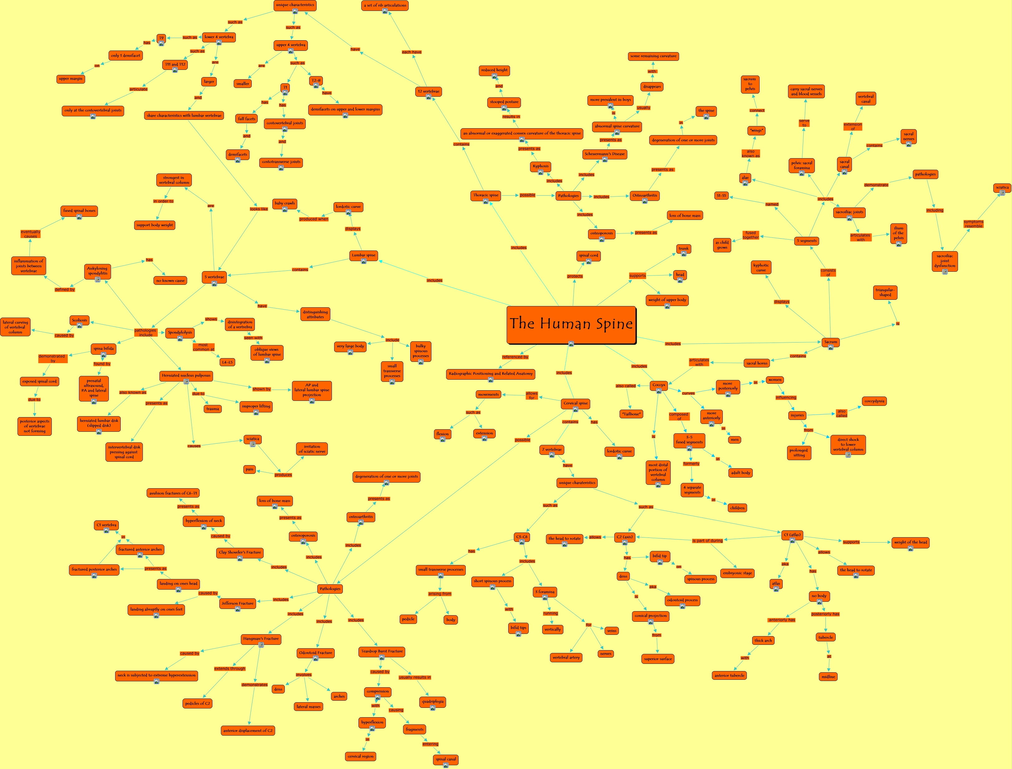 This Concept Map, created with IHMC CmapTools, has information related to: Cindy and Brandy-spine, landing on ones head presents as fractured posterior arches, Cervical spine contains 7 vertebrae, tubercle at midline, Pathologies includes osteoporosis, unique charateristics such as C2 (axis), osteoarthritis presents as degeneration of one or more joints, hyperflexion in cervical region, more posteriorly in women, 5 vertebrae have distinguishing attributes, 5 vertebrae pathologies include Ankylosing spondylitis, osteoporosis presents as loss of bone mass, Herniated nucleus pulposus also known as herniated lumbar disk (slipped disk), Lumbar spine displays lordotic curve, more anteriorly in men, unique charateristics such as C1 (atlas), Odontoid Fracture involves arches, Hangman's Fracture demonstrates anterior displacement of C2, 3 foramina for nerves, pathologies including sacroiliac joint dysfunction, The Human Spine includes Sacrum