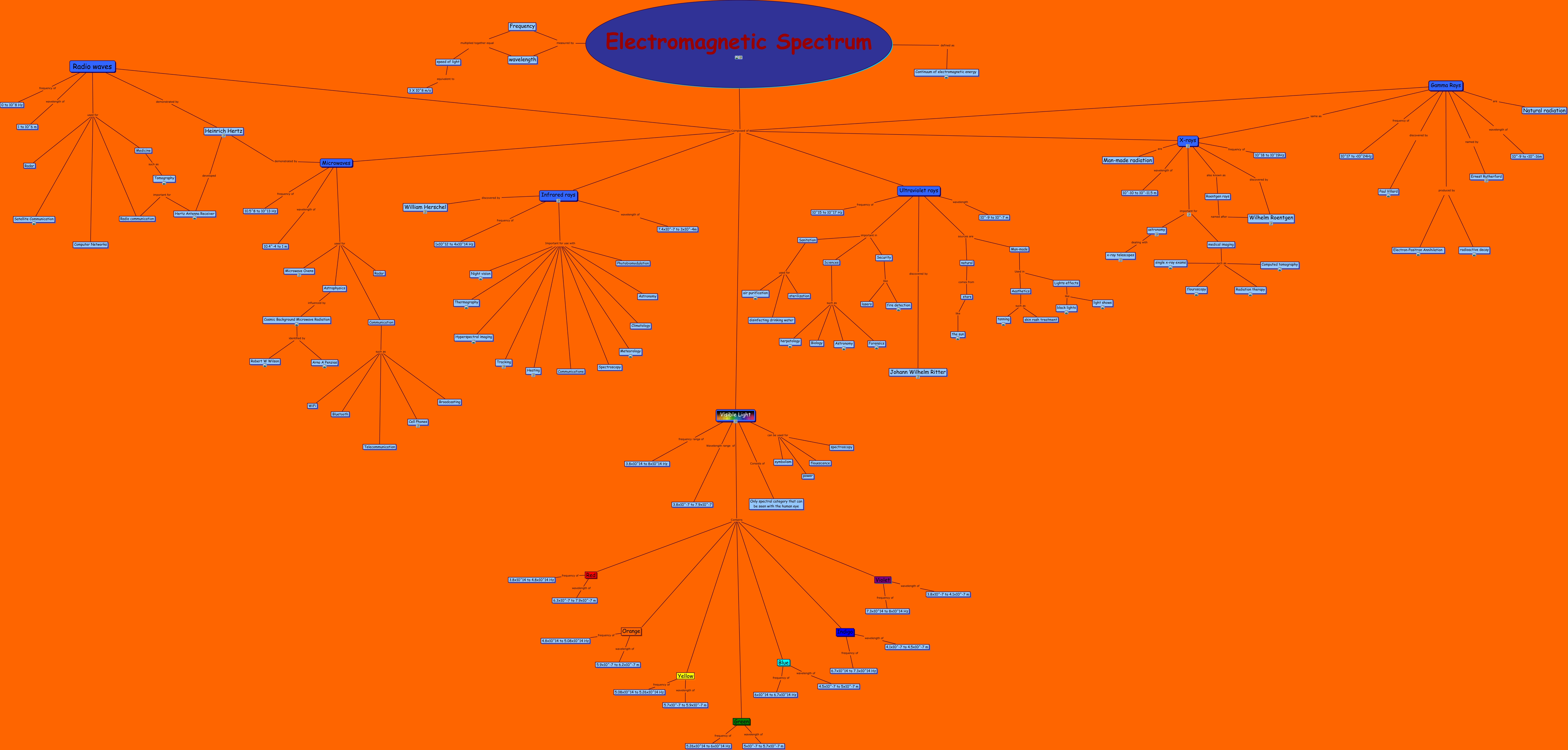 This Concept Map, created with IHMC CmapTools, has information related to: Alex and Nicole, Red wavelength of 6.3x10^-7 to 7.9x10^-7 m, Orange frequency of 4.8x10^14 to 5.08x10^14 Hz, Visible Light Contains Indigo, Ultraviolet rays frequency of 10^15 to 10^17 Hz, Visible Light can be used for flouescence, Ultraviolet rays sources are natural, Gamma Rays are Natural radiation, Visible Light Contains Green, Radio waves used for Computer Networks, Radio waves used for Satellite Communication, Visible Light Contains Yellow, Wilhelm Roentgen discovered by X-rays, Ultraviolet rays Composed of Visible Light, medical imaging such as single x-ray exams, Communication such as Cell Phones, Man-made Used in Lights effects, Infrared rays Important for use with Night vision, Visible Light Contains Violet, Ultraviolet rays important in Sanitation, Microwaves frequency of <math xmlns="http://www.w3.org/1998/Math/MathML"> <mrow> <mtext> 10.5^8 to 10^13 Hz </mtext> </mrow> </math>