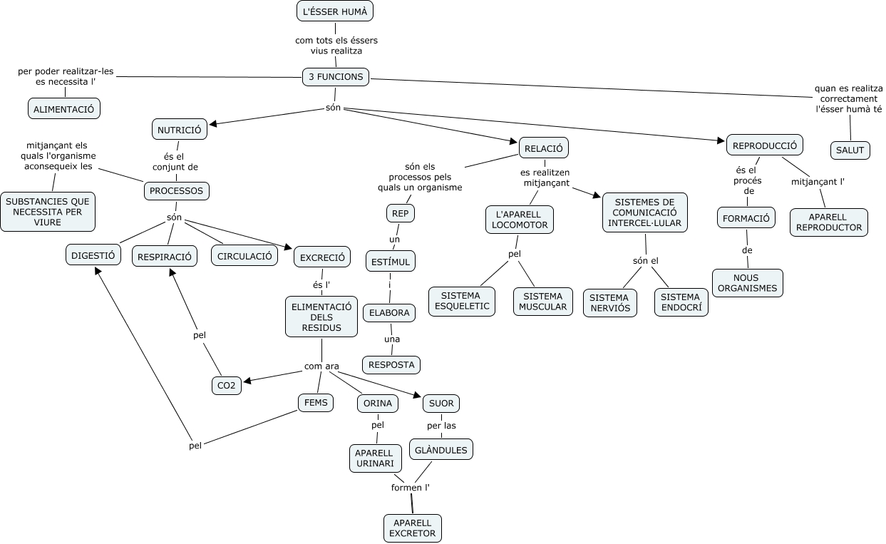 Este Cmap, tiene información relacionada con: ELS APARELLS, 3 FUNCIONS per poder realitzar-les es necessita l' ALIMENTACIÓ, NUTRICIÓ és el conjunt de PROCESSOS, L'ÉSSER HUMÀ com tots els éssers vius realitza 3 FUNCIONS, GLÀNDULES formen l' APARELL EXCRETOR, APARELL URINARI formen l' APARELL EXCRETOR, SISTEMES DE COMUNICACIÓ INTERCEL·LULAR són el SISTEMA NERVIÓS, ELIMENTACIÓ DELS RESIDUS com ara CO2, L'APARELL LOCOMOTOR pel SISTEMA MUSCULAR, PROCESSOS mitjançant els quals l'organisme aconsequeix les SUBSTANCIES QUE NECESSITA PER VIURE, PROCESSOS són DIGESTIÓ, REPRODUCCIÓ és el procés de FORMACIÓ, EST�?MUL i ELABORA, ELIMENTACIÓ DELS RESIDUS com ara SUOR, PROCESSOS són RESPIRACIÓ, FORMACIÓ de NOUS ORGANISMES, 3 FUNCIONS són NUTRICIÓ, SUOR per las GLÀNDULES, ELIMENTACIÓ DELS RESIDUS com ara ORINA, RELACIÓ són els processos pels quals un organisme REP, ORINA pel APARELL URINARI