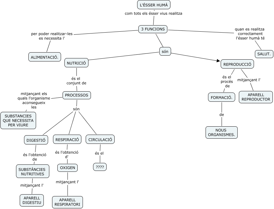 Este Cmap, tiene información relacionada con: elsaparells, PROCESSOS mitjançant els quals l'organisme aconsegueix les SUBSTANCIES QUE NECESSITA PER VIURE, PROCESSOS són RESPIRACIÓ, PROCESSOS són DIGESTIÓ, 3 FUNCIONS quan es realitza correctament l'ésser humà té SALUT., L'ÉSSER HUMÀ com tots els ésser vius realitza 3 FUNCIONS, PROCESSOS són CIRCULACIÓ, DIGESTIÓ és l'obtenció de SUBST�?NCIES NUTRITIVES, NUTRICIÓ és el conjunt de PROCESSOS, CIRCULACIÓ és el ????, SUBST�?NCIES NUTRITIVES mitjançant l' APARELL DIGESTIU, són ???? NUTRICIÓ, 3 FUNCIONS per poder realitzar-les es necessita l' ALIMENTACIÓ., REPRODUCCIÓ mitjançant l' APARELL REPRODUCTOR, OXIGEN mitjançant l' APARELL RESPIRATORI, RESPIRACIÓ és l'obtenció d' OXIGEN, REPRODUCCIÓ és el procés de FORMACIÓ., 3 FUNCIONS REPRODUCCIÓ, FORMACIÓ. de NOUS ORGANISMES.