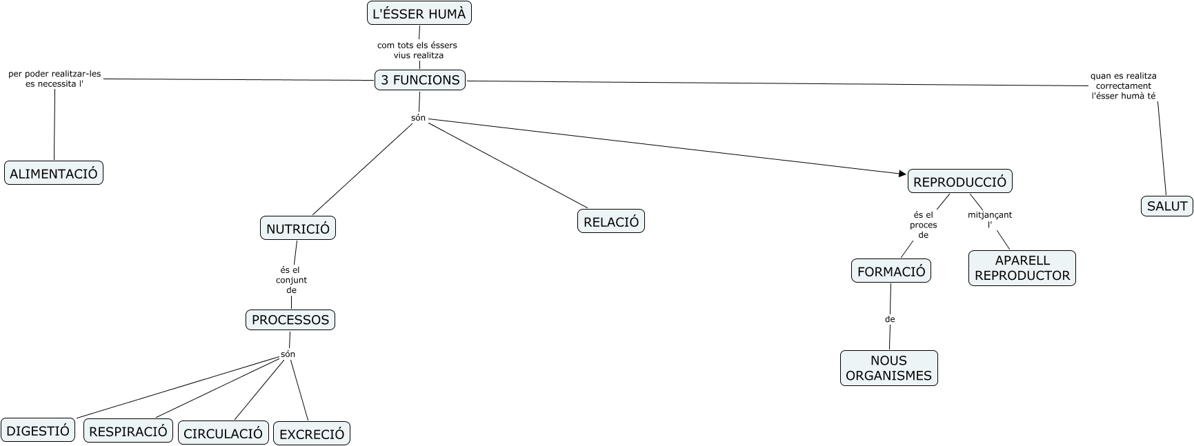 Este Cmap, tiene información relacionada con: Els Aparells, PROCESSOS són EXCRECIÓ, 3 FUNCIONS per poder realitzar-les es necessita l' ALIMENTACIÓ, FORMACIÓ de NOUS ORGANISMES, REPRODUCCIÓ és el proces de FORMACIÓ, PROCESSOS són CIRCULACIÓ, NUTRICIÓ és el conjunt de PROCESSOS, 3 FUNCIONS són NUTRICIÓ, PROCESSOS són RESPIRACIÓ, L'ÉSSER HUMÀ com tots els éssers vius realitza 3 FUNCIONS, 3 FUNCIONS són RELACIÓ, DIGESTIÓ són EXCRECIÓ, REPRODUCCIÓ mitjançant l' APARELL REPRODUCTOR, 3 FUNCIONS quan es realitza correctament l'ésser humà té SALUT, DIGESTIÓ són CIRCULACIÓ, 3 FUNCIONS són REPRODUCCIÓ, DIGESTIÓ són RESPIRACIÓ