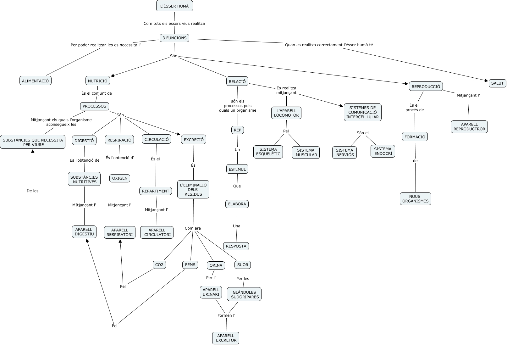 Este Cmap, tiene información relacionada con: ElsAparells, RESPIRACIÓ És l'obtenció d' OXIGEN, REPRODUCCIÓ Mitjançant l' APARELL REPRODUCTROR, CO2 Pel APARELL RESPIRATORI, 3 FUNCIONS Per poder realitzar-les es necessita l' ALIMENTACIÓ, NUTRICIÓ És el conjunt de PROCESSOS, ORINA Per l' APARELL URINARI, L'APARELL LOCOMOTOR Pel SISTEMA ESQUELÈTIC, L'ELIMINACIÓ DELS RESIDUS Com ara CO2, L'ÉSSER HUMÀ Com tots els éssers vius realitza 3 FUNCIONS, L'ELIMINACIÓ DELS RESIDUS Com ara SUOR, 3 FUNCIONS Són REPRODUCCIÓ, PROCESSOS Són RESPIRACIÓ, EST�?MUL Que ELABORA, PROCESSOS Mitjançant els quals l'organisme aconsegueix les SUBSTÀNCIES QUE NECESSITA PER VIURE, APARELL URINARI Formen l' APARELL EXCRETOR, 3 FUNCIONS Són NUTRICIÓ, L'ELIMINACIÓ DELS RESIDUS Com ara FEMS, REP Un EST�?MUL, EXCRECIÓ És L'ELIMINACIÓ DELS RESIDUS, REPARTIMENT De les SUBSTÀNCIES QUE NECESSITA PER VIURE