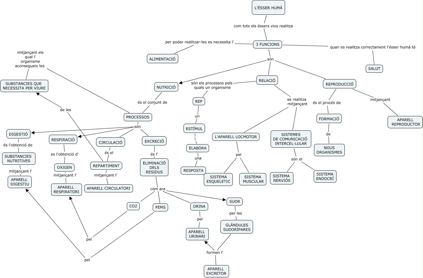 Este Cmap, tiene información relacionada con: els aparells, REPRODUCCIÓ és el procés de FORMACIÓ, PROCESSOS són EXCRECIÓ, OXIGEN mitjançant l' APARELL RESPIRATORI, CO2 pel APARELL RESPIRATORI, REPARTIMENT mitjançant l' APARELL CIRCULATORI, GLÀNDULES SUDOR�?PARES formen l' APARELL EXCRETOR, EXCRECIÓ és l' ELIMINACIÓ DELS RESIDUS, ORINA pel APARELL URINARI, 3 FUNCIONS són NUTRICIÓ, 3 FUNCIONS són RELACIÓ, L'APARELL LOCMOTOR pel SISTEMA MUSCULAR, ELIMINACIÓ DELS RESIDUS com ara SUOR, ELABORA una RESPOSTA, DIGESTIÓ és l'obtenció de SUBSTANCIES NUTRITIVES, RELACIÓ es realitza mitjançant SISTEMES DE COMUNICACIÓ INTERCEL·LULAR, 3 FUNCIONS quan es realitza correctament l'ésser humà té SALUT, L'ÉSSER HUMÀ com tots els éssers vius realitza 3 FUNCIONS, CIRCULACIÓ és el REPARTIMENT, L'APARELL LOCMOTOR pel SISTEMA ESQUELETIC, RELACIÓ es realitza mitjançant L'APARELL LOCMOTOR