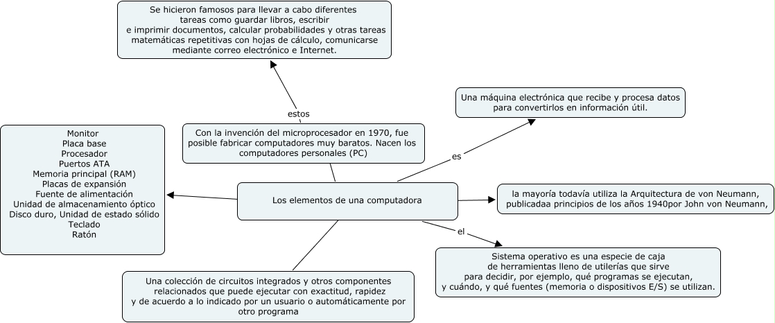 Este Cmap, tiene información relacionada con: Los elementos de una computadora, Con la invención del microprocesador en 1970, fue posible fabricar computadores muy baratos. Nacen los computadores personales (PC) estos Se hicieron famosos para llevar a cabo diferentes tareas como guardar libros, escribir e imprimir documentos, calcular probabilidades y otras tareas matemáticas repetitivas con hojas de cálculo, comunicarse mediante correo electrónico e Internet., Los elementos de una computadora ???? la mayoría todavía utiliza la Arquitectura de von Neumann, publicadaa principios de los años 1940por John von Neumann,, Los elementos de una computadora ???? Una colección de circuitos integrados y otros componentes relacionados que puede ejecutar con exactitud, rapidez y de acuerdo a lo indicado por un usuario o automáticamente por otro programa, Los elementos de una computadora ???? Monitor Placa base Procesador Puertos ATA Memoria principal (RAM) Placas de expansión Fuente de alimentación Unidad de almacenamiento óptico Disco duro, Unidad de estado sólido Teclado Ratón, Con la invención del microprocesador en 1970, fue posible fabricar computadores muy baratos. Nacen los computadores personales (PC) ???? Los elementos de una computadora, Los elementos de una computadora es Una máquina electrónica que recibe y procesa datos para convertirlos en información útil., Los elementos de una computadora el Sistema operativo es una especie de caja de herramientas lleno de utilerías que sirve para decidir, por ejemplo, qué programas se ejecutan, y cuándo, y qué fuentes (memoria o dispositivos E/S) se utilizan.