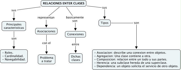 Este Cmap, tiene información relacionada con: Relaciones_entre_clases, RELACIONES ENTER CLASES sus Tipos, RELACIONES ENTER CLASES basicamente son Conexiones, RELACIONES ENTER CLASES representan Asociaciones, Conexiones entre Dichas clases, Tipos son - Asociacion: describe una conexion entre objetos. - Agregacion: Una clase contiene a otra. - Composicion: relacion entre un todo y sus partes. - Herencia: una subclase hereda de una superclase. - Dependencia: un objeto solicita el servicio de otro objeto., Principales caracteristicas son - Roles. - Cardinalidad. - Navegabilidad., RELACIONES ENTER CLASES sus Principales caracteristicas, Asociaciones con el Problema a tratar