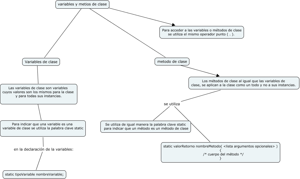 Este Cmap, tiene información relacionada con: variabes y metodos de clase, Los métodos de clase al igual que las variables de clase, se aplican a la clase como un todo y no a sus instancias. se utiliza static valorRetorno nombreMetodo( <lista argumentos opcionales> ) { /* cuerpo del método */ }, Variables de clase ???? Las variables de clase son variables cuyos valores son los mismos para la clase y para todas sus instancias., Las variables de clase son variables cuyos valores son los mismos para la clase y para todas sus instancias. ???? Para indicar que una variable es una variable de clase se utiliza la palabra clave static, Los métodos de clase al igual que las variables de clase, se aplican a la clase como un todo y no a sus instancias. se utiliza Se utiliza de igual manera la palabra clave static para indicar que un método es un método de clase, metodo de clase ???? Los métodos de clase al igual que las variables de clase, se aplican a la clase como un todo y no a sus instancias., variables y metios de clase ???? Variables de clase, Para indicar que una variable es una variable de clase se utiliza la palabra clave static en la declaración de la variables: static tipoVariable nombreVariable;, variables y metios de clase ???? Para acceder a las variables o métodos de clase se utiliza el mismo operador punto ( . )., variables y metios de clase ???? metodo de clase