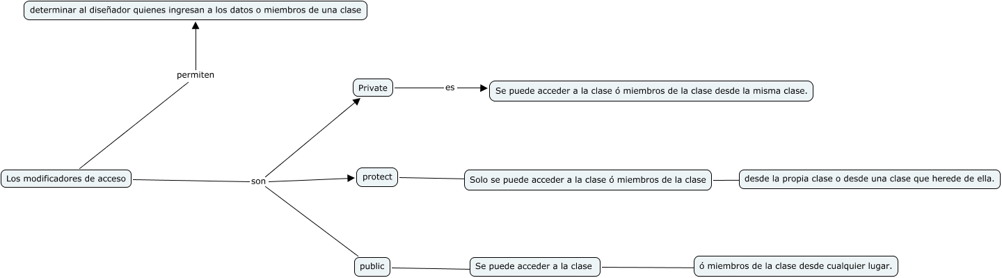 Este Cmap, tiene información relacionada con: modificadores de acceso, protect ???? Solo se puede acceder a la clase ó miembros de la clase, Los modificadores de acceso son public, public ???? Se puede acceder a la clase, Se puede acceder a la clase ???? ó miembros de la clase desde cualquier lugar., Los modificadores de acceso permiten determinar al diseñador quienes ingresan a los datos o miembros de una clase, Solo se puede acceder a la clase ó miembros de la clase ???? desde la propia clase o desde una clase que herede de ella., Private es Se puede acceder a la clase ó miembros de la clase desde la misma clase., Los modificadores de acceso son Private, Los modificadores de acceso son protect