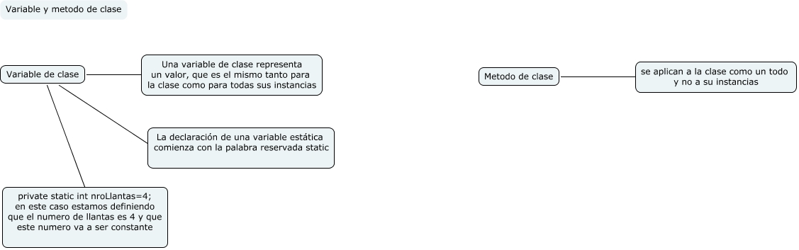 Este Cmap, tiene información relacionada con: Variable y metodo de clase, Metodo de clase ???? se aplican a la clase como un todo y no a su instancias, Variable de clase ???? La declaración de una variable estática comienza con la palabra reservada static, Variable de clase ???? Una variable de clase representa un valor, que es el mismo tanto para la clase como para todas sus instancias, Variable de clase ???? private static int nroLlantas=4; en este caso estamos definiendo que el numero de llantas es 4 y que este numero va a ser constante