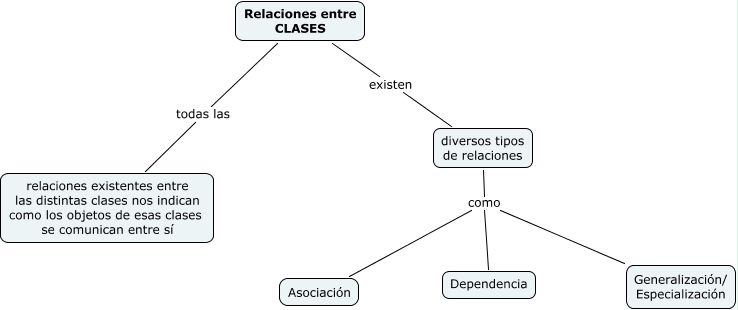 Este Cmap, tiene información relacionada con: RELACIONESENTRECLASES, diversos tipos de relaciones como Generalización/ Especialización, Relaciones entre CLASES todas las relaciones existentes entre las distintas clases nos indican como los objetos de esas clases se comunican entre sí, diversos tipos de relaciones como Asociación, diversos tipos de relaciones como Dependencia, Relaciones entre CLASES existen diversos tipos de relaciones