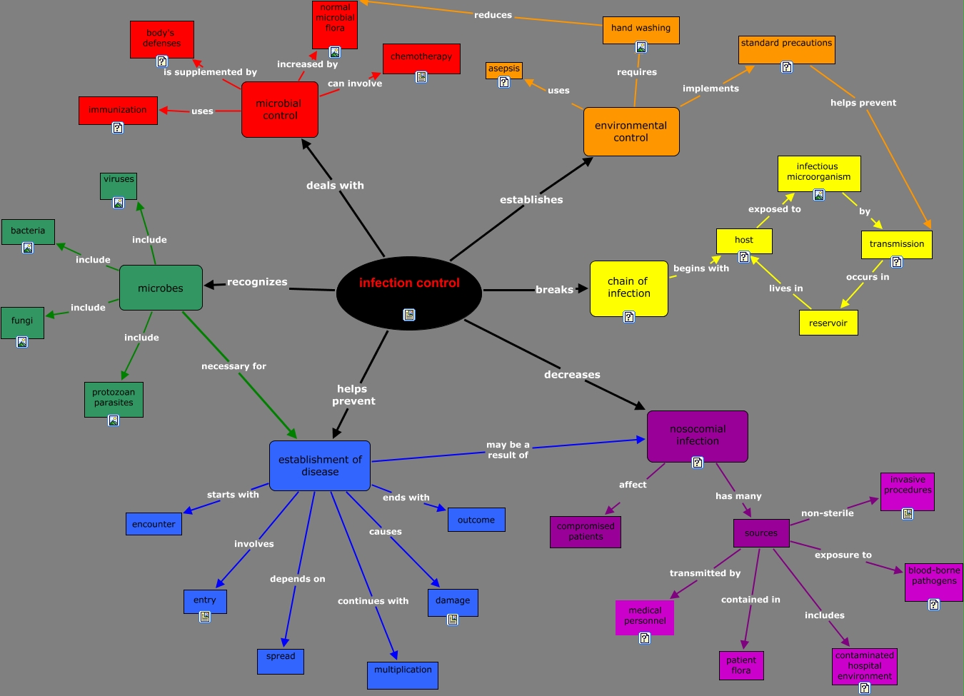 This Concept Map, created with IHMC CmapTools, has information related to: DERRILL,GARY, hand washing reduces normal microbial flora, nosocomial infection has many sources, establishment of disease starts with encounter, infection control decreases nosocomial infection, environmental control implements standard precautions, environmental control uses asepsis, establishment of disease involves entry, microbial control is supplemented by body's defenses, environmental control requires hand washing, infection control recognizes microbes, chain of infection begins with host, microbes include fungi, establishment of disease continues with multiplication, infectious microorganism by transmission, reservoir lives in host, sources contained in patient flora, sources includes contaminated hospital environment, sources non-sterile invasive procedures, standard precautions helps prevent transmission, microbial control increased by normal microbial flora