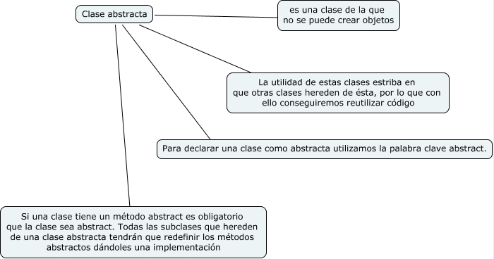 Este Cmap, tiene información relacionada con: Clase abstracta, Clase abstracta ???? Si una clase tiene un método abstract es obligatorio que la clase sea abstract. Todas las subclases que hereden de una clase abstracta tendrán que redefinir los métodos abstractos dándoles una implementación, Clase abstracta ???? Para declarar una clase como abstracta utilizamos la palabra clave abstract., Clase abstracta ???? es una clase de la que no se puede crear objetos, Clase abstracta ???? La utilidad de estas clases estriba en que otras clases hereden de ésta, por lo que con ello conseguiremos reutilizar código